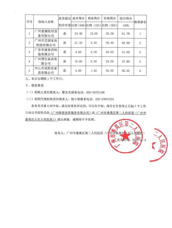 番禺第二人民醫(yī)院醫(yī)用家具二期項目中標(biāo)結(jié)果公告